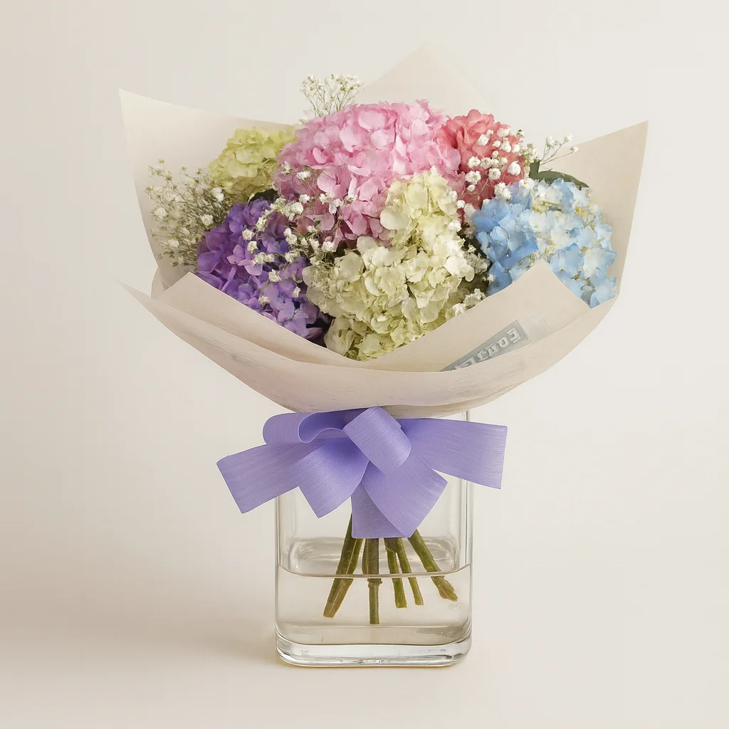 Hermoso bouquet de hortensias variadas o unicolor con variedad de follajes acordes decorado con papel coreano. Incluye lazo de cinta interlón, tarjeta dedicatoria, florero y manual de cuidados. Algunos follajes pueden cambiar según stock disponible.