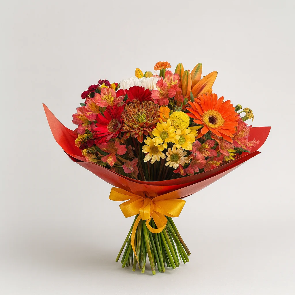 Hermoso bouquet con girasoles, gerberas y variedad de follajes decorado con papel coreano y lazo de cinta. Incluye tarjeta dedicatoria.
