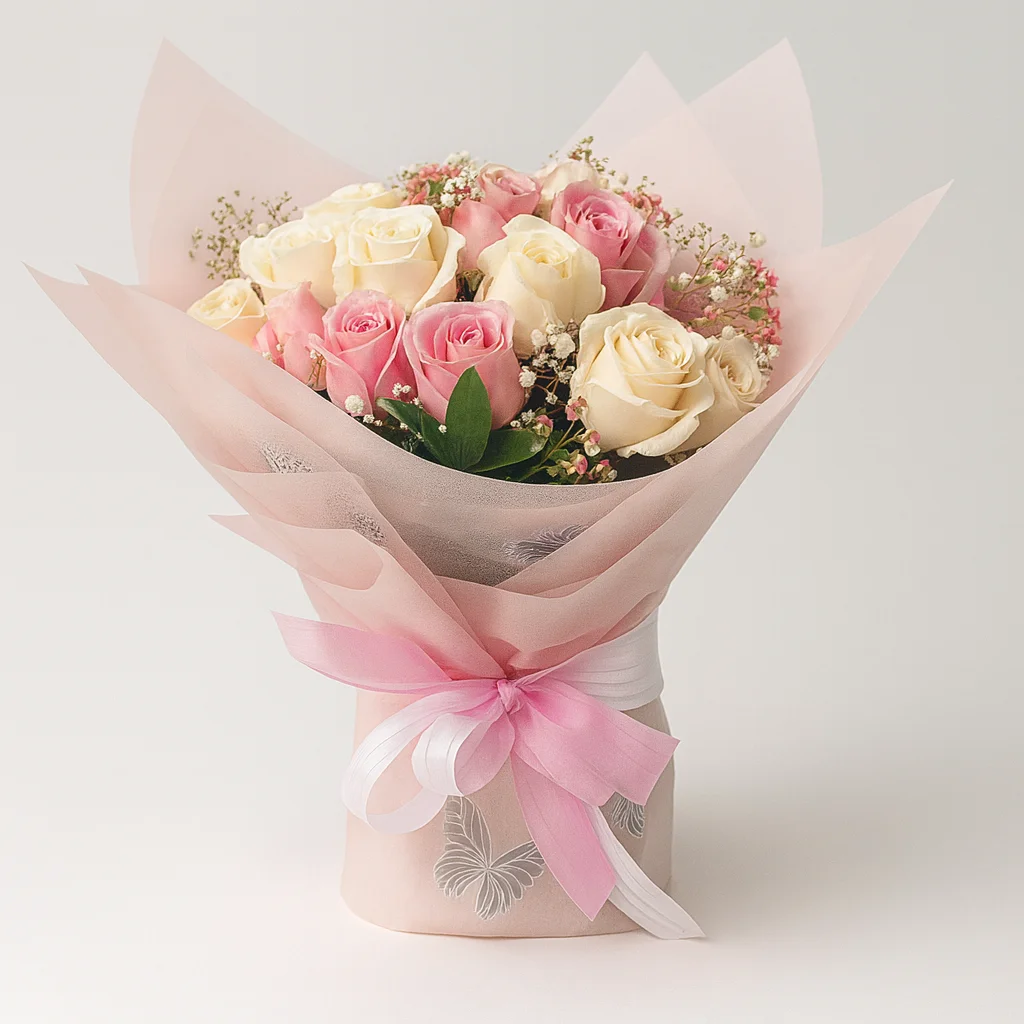 Diseño Tierno bouquet. Colores y variedad de follajes según stock, decorado con papel coreano y lazo de cinta interlón o satinada. Incluye tarjeta dedicatoria. Colores a elección del cliente varios o unicolor.